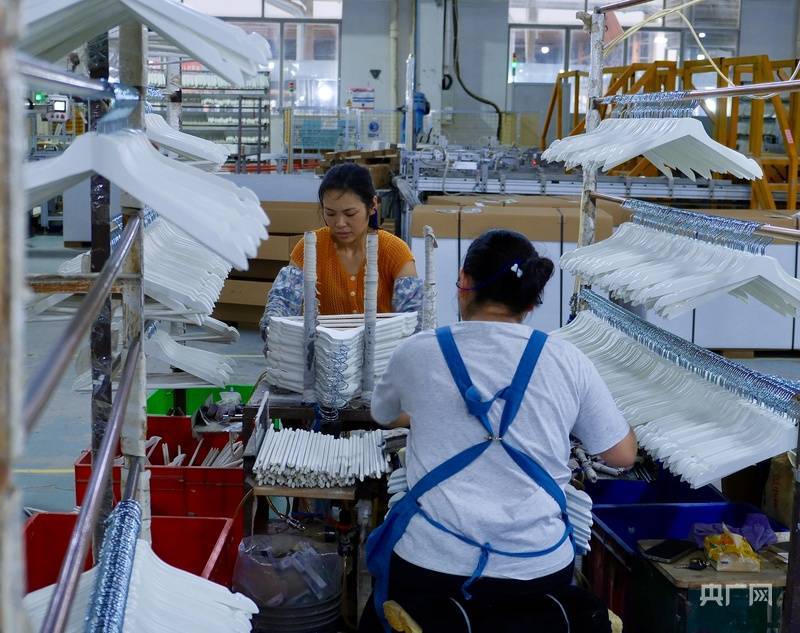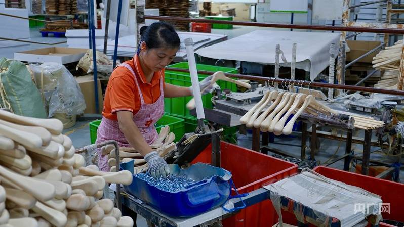 这是衣架拼装工序中上挂钩的症结,古代人工给衣架上钩(总台中邦之声记者管昕 摄)